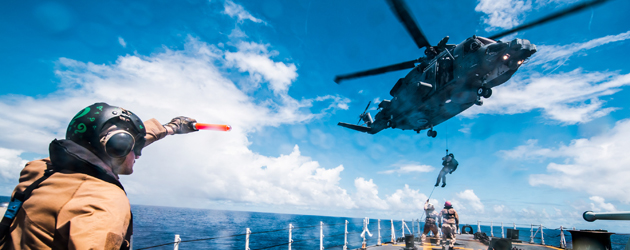 Members of the Air Detachment onboard HMCS Winnipeg conduct a foc’sle transfer and hoist training with the CH-148 Cyclone, callsign Guardian, during Operation Projection while sailing the Pacific Ocean, August 17, 2022.