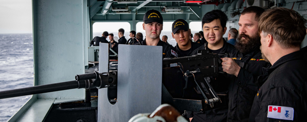 Operation PROJECTION Sailor 3rd Class Brair Goudie participates in a .50 calibre heavy machine gun training during Operation PROJECTION INDO – PACIFIC on 1 April 2023 in the Atlantic Ocean. Photo: S1 Taylor Congdon, Canadian Armed Forces Photo