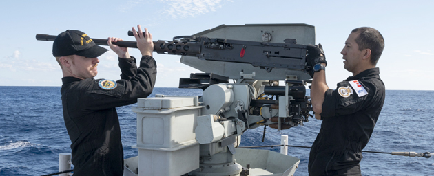 (Left to right) Sailor 3rd Class Kelley (S3) and Sailor 2nd Class (S2) Yaretz of His Majesty's Canadian Ship (HMCS) Vancouver conduct regular maintenance on the .50 calibre heavy machine gun during Exercise ANNUALEX in the Philippine Sea on 14 November 2023. Photo credit: Corporal Alisa Strelley, Canadian Armed Forces Photo.
