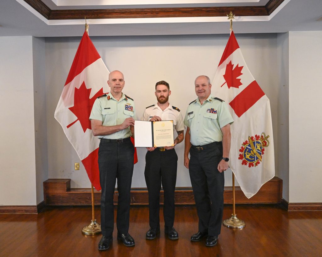 [caption id="attachment_33226" align="aligncenter" width="595"] Photo de groupe des récipiendaires de la Journée de reconnaissance des Forces canadiennes au mess des adjudants et sergents du Quartier général de la Défense nationale, à Ottawa, le 16 juin.[/caption]Peter MallettRédacteur du Lookout Lorsqu'un membre du NCSM Vancouver a vu son ami en situation d'urgence médicale en décembre 2021, sa formation militaire s'est mise en branle. Un an plus tard, le matelot de première classe (Mat1) Charles Tucker a reçu une mention élogieuse du chef d'état-major de la Défense et un prix du lien vital des services de santé d'urgence de la Colombie-Britannique pour avoir sauvé la vie d'un ancien camarade de classe. Le matelot de 1re classe Tucker a récemment été affecté au NCSM Calgary, mais il se trouvait à Vancouver lorsqu'il a effectué le sauvetage le 19 décembre 2021, pendant ses vacances à Kelowna. Je ne me considère pas vraiment comme un héros, mais c'est avec humilité et honneur que je reçois ce prix", a déclaré le Matelot de 1re classe Tucker. "J'espère que tous ceux qui liront mon histoire prendront conscience de l'importance d'une formation adéquate en RCP. Cela pourrait sauver la vie de votre meilleur ami, d'un membre de votre famille ou même d'un étranger" Le Matelot de première classe Tucker est un opérateur de capteurs électroniques de la marine (NESOP) âgé de 28 ans. Lorsque je suis entré dans la pièce et que je l'ai vue convulser, j'ai d'abord pensé qu'elle faisait une blague ; elle a parfois un sens de l'humour morbide", a déclaré le Caporal-chef Tucker. "Il a immédiatement appelé le 911, a utilisé sa formation médicale des Forces armées canadiennes et a pratiqué la réanimation cardio-pulmonaire sur Tasia avec l'aide du répartiteur jusqu'à ce que les ambulanciers arrivent et prennent la relève.[caption id="attachment_33225" align="aligncenter" width="595"] (À gauche)...