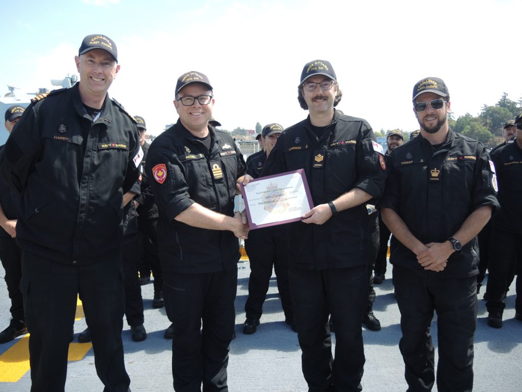 Since HMCS Max Bernays was always destined to be a West Coast ship, the Ship’s Company falls into formation on the flight deck-turned-parade square to recognize the first East-to-West Coast handover of a position in the Command Team.