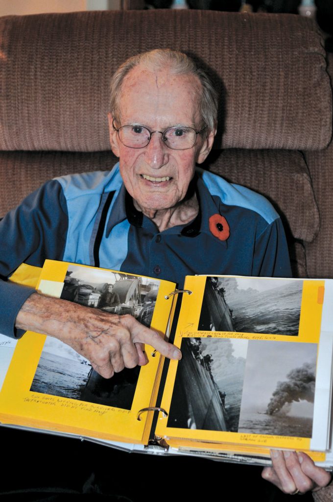Eighty-nine-year-old Second World War veteran Gilbert Davis was not only the stoker mechanic on board HMC Ships Merrittonia and Bellechasse, he was also an inadvertent photojournalist. During his six years of service escorting merchant navy ships across the Atlantic, and minesweeping in the Pacific, he took hundreds of photos. “One of the first things I owned was a camera; it was nothing like the fancy cameras they have now. I bought it for about a dollar fifty,” he recalls from his home off Gorge Road in Victoria. Cameras on ships were a rarity, and Davis was one of maybe two sailors on board fortunate to have one. “The navy didn’t like the idea of cameras because the photographs might fall into enemy hands, and if there were photos of sensitive things, it may give the enemy an advantage. I never developed any of the photographs until after the war when I was back in Moose Jaw,” he says. He’d keep the rolls of film from his Kodak 127 Baby Brownie box camera in his footlocker. Each roll took 12 photos. His photos ranged from posing with shipmates on Douglas Street in Victoria, to the hard reality of a sailor’s life at sea. His favourite photo was taken when HMCS Merrittonia was being fuelled at sea by an oiler. “I took those photos back then for my own keeping. My photos reflect day-to-day life in the Royal Canadian Navy aboard a convoy escort ship, whereas the embedded reporters of today are more often trying to get the spectacular photos of combat,” he says. One photo he took of a sailor being rescued from a torpedoed ship showed up in a special edition of Reader’s Digest Canadians at War years after the war ended. “I was very surprised to find my photo...