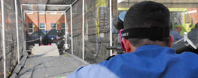 LS David Murray-Trottier sights up a shot at the TNT Paintball booth at the Lookout Industrial Trade Show.
