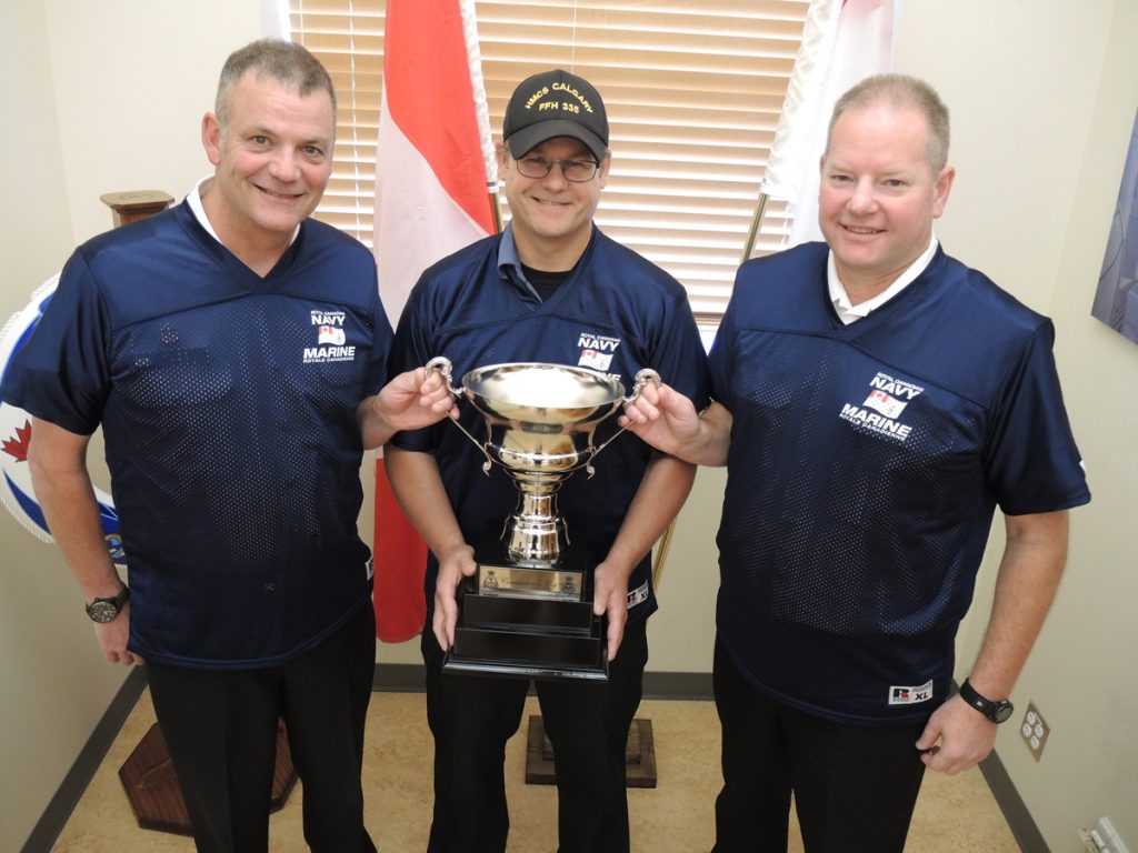[caption id="attachment_30895" align="aligncenter" width="595"] (Left) Chief Petty Officer First Class David Bisal, Fleet Chief, Lieutenant (Navy) David MacLellan of HMCS Calgary and RCN team captain, and Commodore David Mazur, Canadian Fleet Pacific Commanding Officer, show off the Commodore’s Cup trophy. Photo: Peter Mallett/Lookout Newspaper.[/caption] Peter Mallett, Staff Writer — The RCN team captain and wide receiver divulged some of his team’s strategy ahead of the Oct. 14 flag football game between the Royal Canadian Navy (RCN) and Royal Canadian Air Force (RCAF). “Having fun at this competition will be our key to winning,” said Lieutenant (Navy) David MacLellan of HMCS Calgary. “We have a talented group of players looking to put on a show and it’s always nice to play a team from outside the base.” Over 200 chairs and temporary bleachers have been placed at the Colville Road sports field for the Commodore’s Cup – a new tradition that honours current and past Commanders of Canadian Fleet Pacific (CANFLTPAC). The RCN’s 12-player team consists of Calgary’s defending champion intramural flag football team and other Maritime Forces Pacific (MARPAC) units. Their Air Force opponents come from 19 Wing Comox. Lt(N) MacLellan said his team has been practising twice weekly at Colville Road and working hard in preparation for the game. The team will wear specially made blue football jerseys for the game. The game’s trophy was reconditioned from a former Broom Ball trophy and is ready to have the name of its first champion etched on one of its panels, said Commodore (Cmdre) David Mazur, CANFLTPAC Commanding Officer. “This event is important for the Fleet because we are always looking for opportunities to get the ships’ crews out for some exercise and to build morale,” Cmdre Mazur said. He also said he was looking forward to developing a new military sporting...