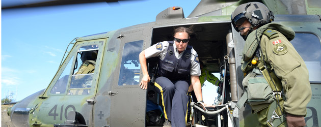 RCMP Constables Amanda McGillvray disembarks a CH-146 Griffon helicopter during a CF assistance to law enforcement scenario on Operation NANOOK.