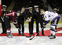 [caption id="attachment_208" align="alignright" width="200" caption="RAdm Nigel Greenwood, Commander Maritime Forces Pacific, and Cdr David Mazur, Commanding Officer of HMCS Vancouver, are joined by Darren Parker, Royals’ Senior Vice President Sales and Marketing, at centre ice for the puck drop."][/caption]Story By: Base Public Affairs A week ago, the largest arena in Victoria was brimming with hockey fans, including a large contingent from CFB Esquimalt. Military members were the special guests of the Victoria Royals, the city’s Western Hockey League team, during their March 3 game against the Vancouver Giants at the Save-on-Foods Memorial Centre. Front and centre in the military appreciation night were sailors from HMCS Vancouver, freshly back from seven months in the Mediterranean enforcing United Nation’s imposed arms embargo against Libya. The Royals also donated more than 150 free tickets, which were given to deserving personnel from the Formation, and discounted general tickets for CF members and their families. As hockey fans arrived at the Memorial Centre, they were able to check out the Fleet Dive Unit bomb disposal truck and see the bomb disposal robot in action. They also received a CF promotional item as a souvenir of the evening. The pre-game show was all about the Canadian Forces. Vancouver crew members formed the Flag Party on the ice while the Naden Band performed the national anthem. At the conclusion of ‘Oh Canada”, a locally produced DND video highlighting all three elements of the CF played on the megatron screens as announcer Cliff Lequesne talked about the work done by the CF. To the delight and surprise of the crowd, three search and rescue technicians from 442 Squadron Comox, hiding in the rafters, repelled down to the ice to hand deliver the ceremonial puck to Marty the Marmot. “It is very special to rappel from the roof and land...
