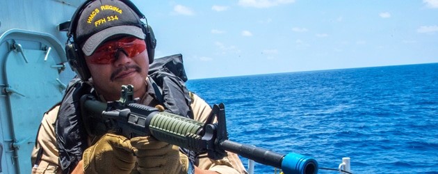 In Photos: Operation PROJECTION Apr 8, 2019 Photo by Corporal Stuart Evans, BORDEN Imaging Services SLt In-Kee Kim of HMCS Regina’s boarding party team conducts simulation training during Operation PROJECTION Asia Pacific, March 17.
